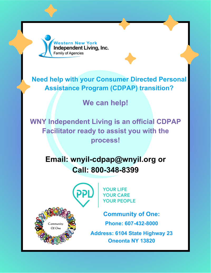 Western NY Independent Living (with CCFI) is excited to be an approved facilitator for the Consumer Directed Personal Assistance Program (CDPAP).